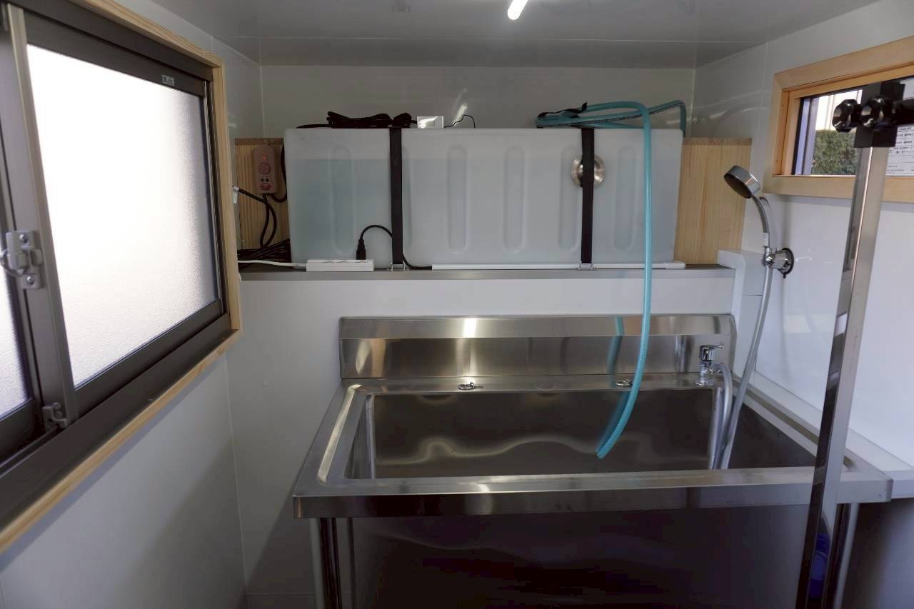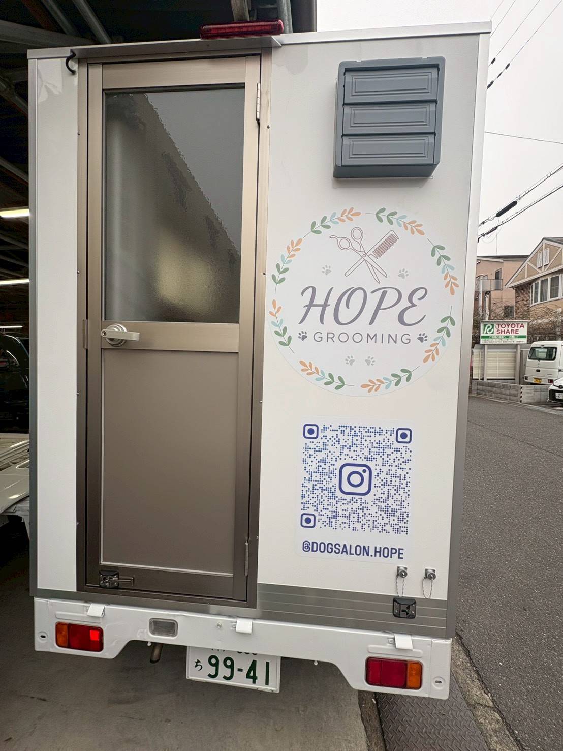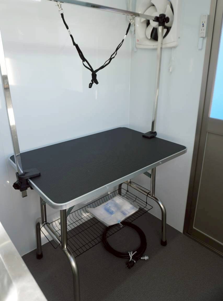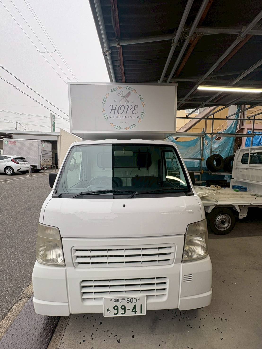 | 紹介文 | 兵庫県でトリミングをはじめられるお客様に軽トラックタイプのトリミングカーを納車しました。当社のトリミングカー(換気扇、外部電源、コンセント、LED照明、保温・加熱ヒーター、窓冊子、小窓設置、洗浄用バス・シャワー水栓、給排水タンク200L、ウィンドエアコン、ドア、断熱材、バックカメラ、網戸、トリミング用テーブル、ラッピング、ポータブル電源などの設備)をご注文いただきました。兵庫県でトリミングを検討されている方は是非ご利用ください。繁盛することを祈願しております! |