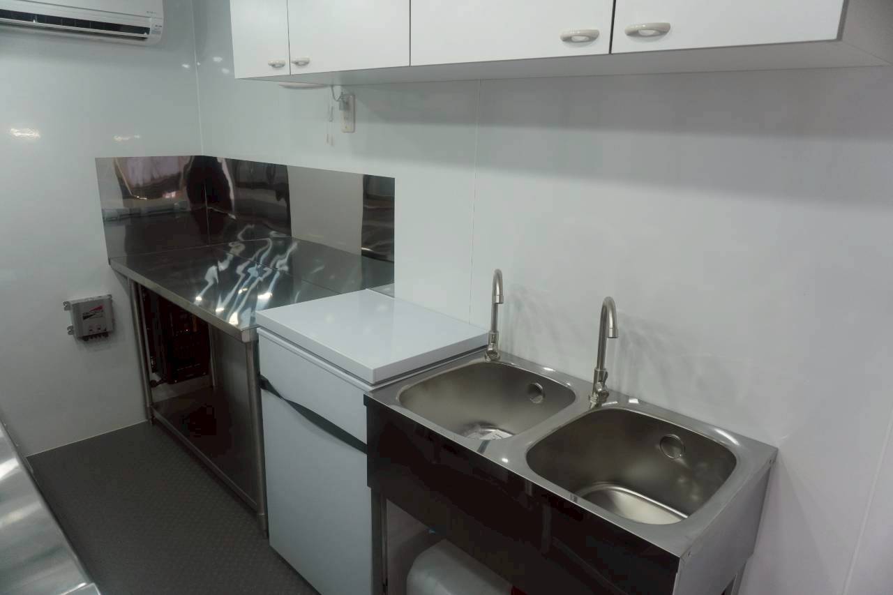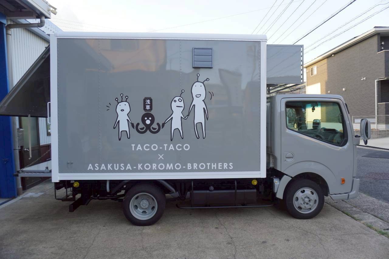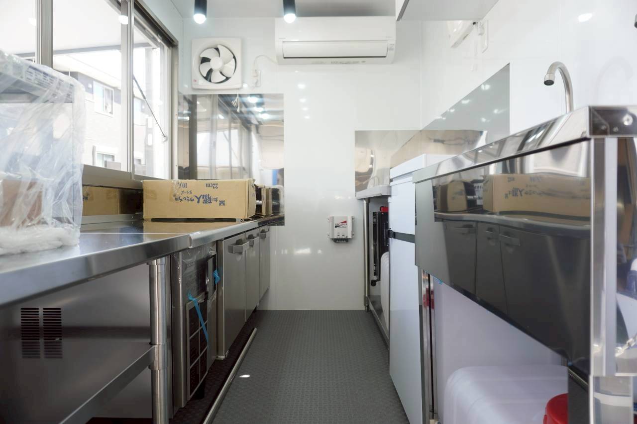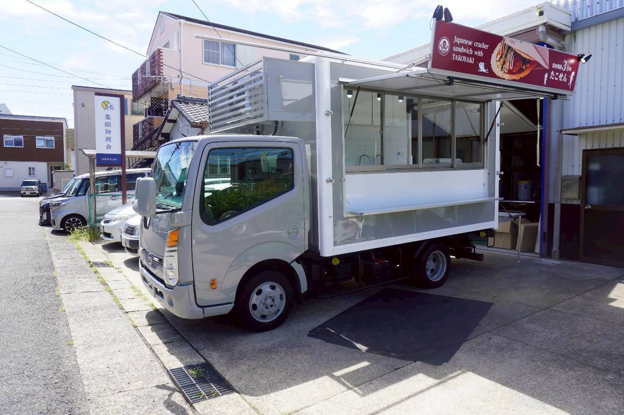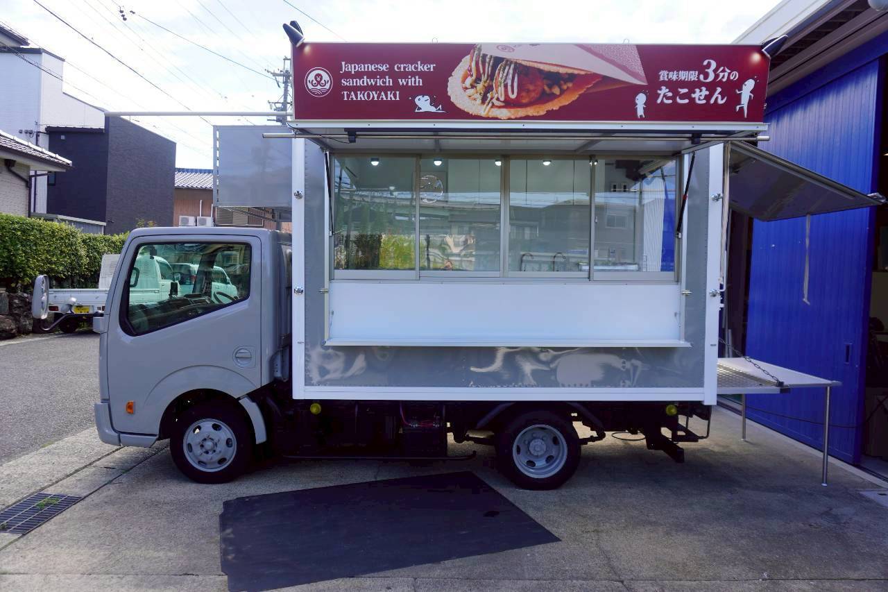 紹介文 東京でたこせんを販売をされるお客様にトラックタイプのキッチンカーを納車しました。当社のCプランをベースに全塗装 、コールドテーブル、給排水タンク200L、タンク蓋加工、エアコン、室外機リーゼント加工、給排水タンクベルト固定、収納棚、、平棚、作業台サイズ変、インバーター、接客テーブル(200下げ)・跳ね上げ扉(200出し)、後方扉にレールカーテン、跳ね上げ看板設置、タペストリー固定器具前後、跳ね上げ扉のれん掛け器具、外部電源・コンセント追加、のぼり金具(前・後)、ガスボンベ固定、耐熱ガラス、ステンレス加工、跳ね上げ看板レール照明、レール照明追加、コンセント追加、後方架設テーブル、横断幕取り付け金具、換気扇追加をオプションでご注文いただきました。東京都でこちらのキッチンカーを見かけられましたら是非お立ち寄りください。繁盛することを祈願しております!